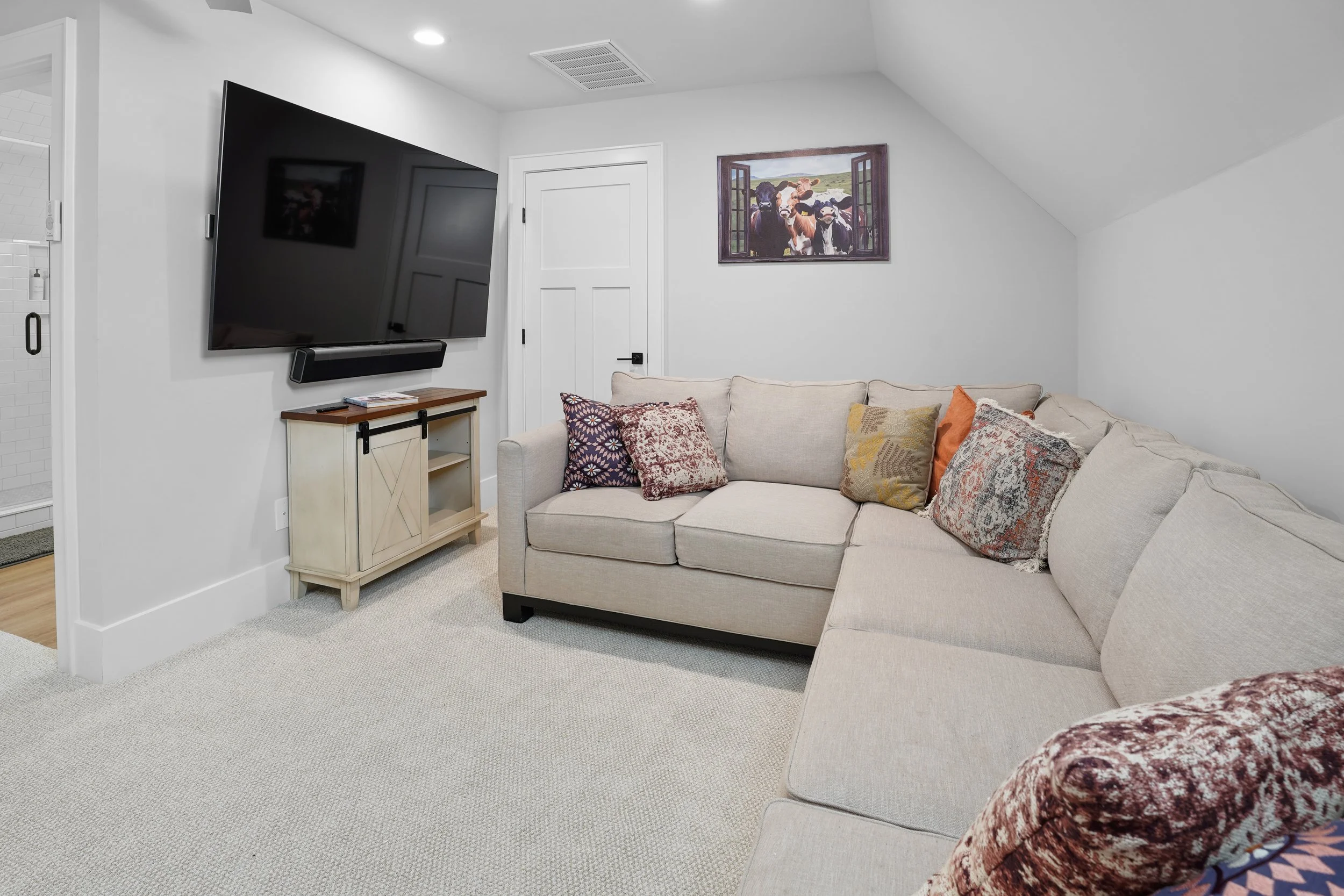 ‘The Hidden Hay Loft’ is situated at the top of the home (3rd floor) and is an expansive space with two full-size beds and a large L-shape pull-out sofa bed. This boasts an ensuite bathroom with a large walk-in shower and is a fantastic space for the younger members to escape. It comfortably sleeps up to six people and is a great getaway from the rest of the home.